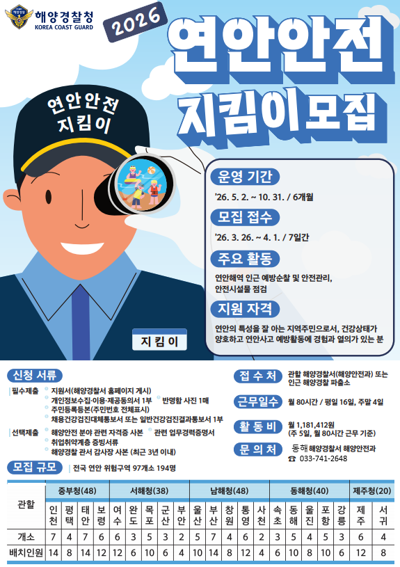 동해해양경찰서 관계자는 “연안 환경에 익숙한 지역 주민들이 참여함으로써 보다 촘촘한 연안 안전관리 체계를 구축할 수 있을 것으로 기대한다”며 “연안사고 예방은 물론 지역 일자리 창출에도 도움이 될 것”이라고 말했다.
