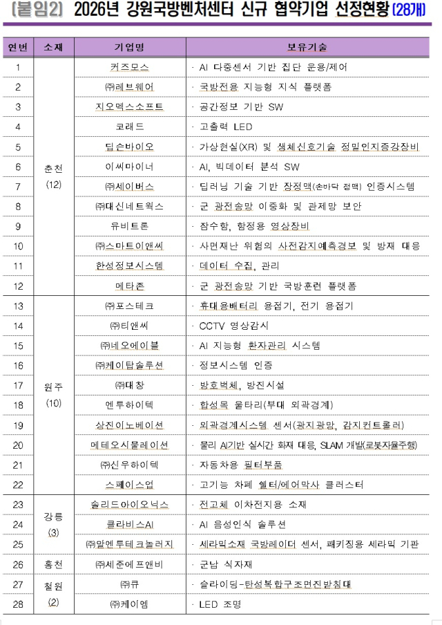 도와 강원국방벤처센터는 지난 2월 방산 분야 진출 또는 방산 전환을 희망하는 기업을 대상으로 협약기업을 공개 모집해 심사를 거쳐 최종 28개 사를 올해 협약기업으로 선정했다. 이번에 선정된 기업들은 반도체, 인공지능(AI), GOP 경계과학화체계 등 첨단기술 분야에서 경쟁력을 보유한 유망 기업들로 평가된다.