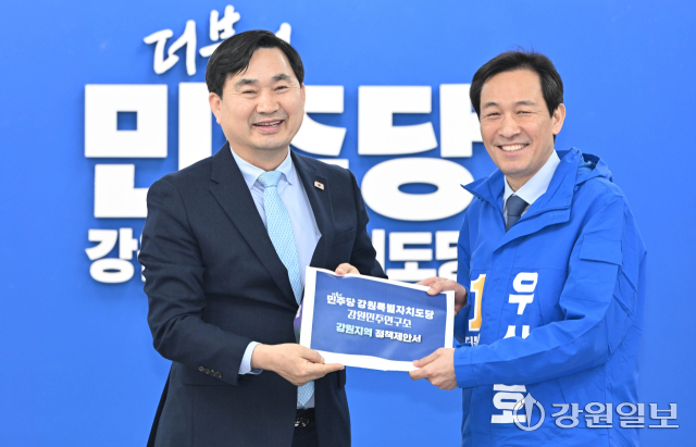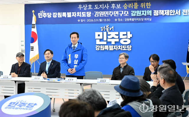 더불어민주당 강원자치도당(위원장:김도균)은 9일 도당 회의실에서 우상호 도지사 예비후보에게 '더불어민주당 강원자치도당 산하 강원민주연구소 강원지역 정책제안서'를 전달했다. 신세희기자
