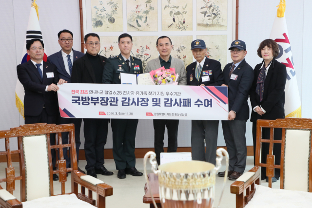 강원특별자치도는 국방부 유해발굴감식단이 추진한 ‘민·관·군 협업 6·25전사자 유가족 집중 찾기’ 사업에서 전국 최초 우수기관으로 선정돼 9일 국방부장관 감사장과 감사패를 수상했다. 이날 행사에는 김진태 지사를 비롯해 국방부 유해발굴감식단, 6.25 참전 유공자회 도지부 등이 함께 참석했다.