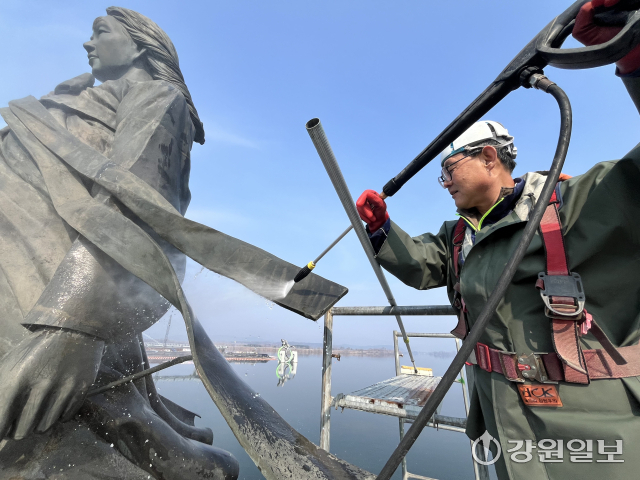 10일 오전 찾은 소양강처녀상 앞. 작업자 4명이 구명 로프조끼를 착용한 채 분주히 움직였다. 1년에 한 번 돌아오는 소양강처녀상의 ‘목욕날’을 맞아 높이 12m에 달하는 동상 세척 작업이 진행됐다. 철구조물 위로 올라간 작업자가 동상 얼굴을 향해 고압세척기를 쏘자 물방울이 사방으로 튀었다. 겨우내 내려앉은 미세먼지와 거미줄, 새 배설물이 한꺼번에 씻겨 내려갔다. 햇빛을 받은 동상은 물기가 마르며 다시 청동빛을 되찾았다.