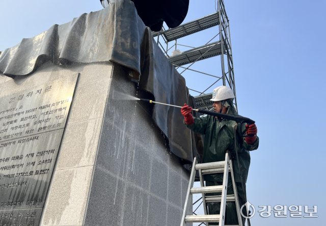 김씨는 “소양강처녀상도 약품을 네번 정도 바꿔가며 재질에 맞는 세정제를 찾았다”며 “옷주름이나 손 관절 사이 접합면까지 깨끗하게 닦아내기 위해 고압세척을 여러차례 반복한다”고 말했다.