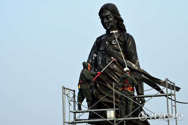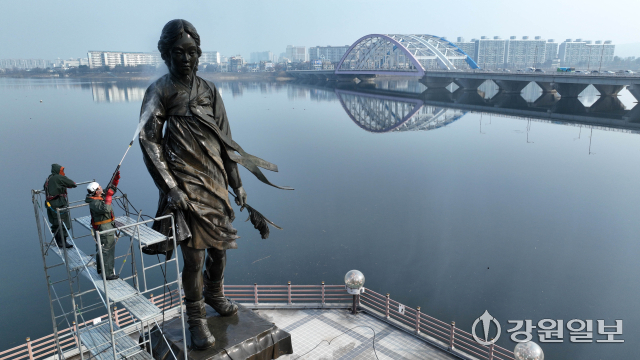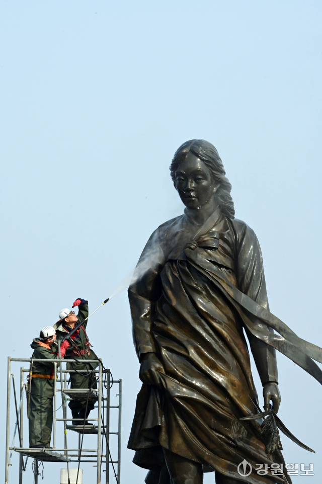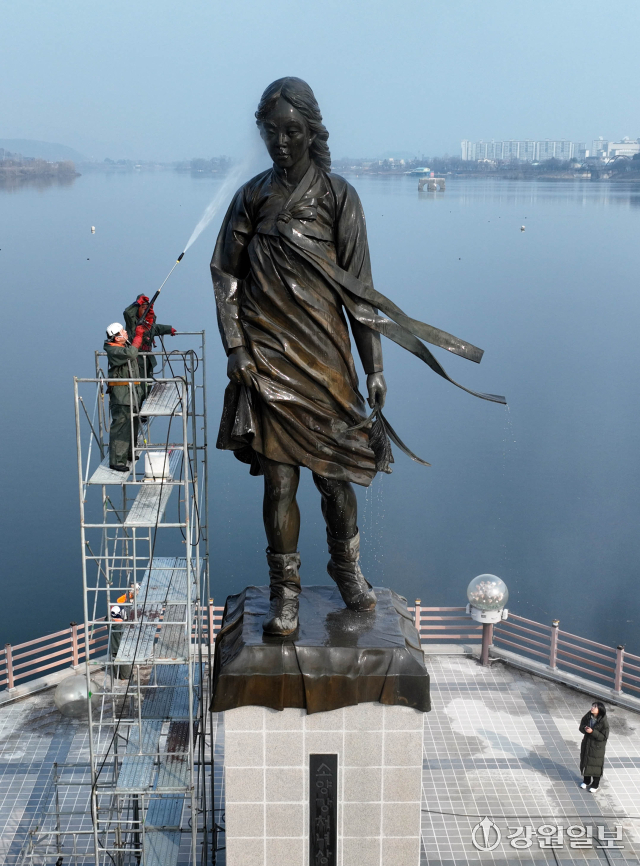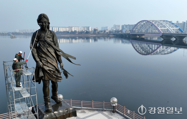 10일 춘천시 소양2교 인근에 있는 소양강처녀상에서 관계자들이 봄맞이 물청소를 하며 겨우내 찌든 때를 씻어내고 있다.