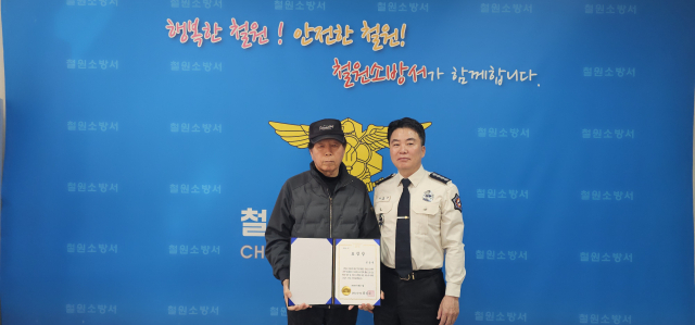 철원소방서는 11일 오전 소방서 서장실에서 지난달 동송읍 오덕리에서 발생한 주택 화재를 초기에 진압해 피해 확산을 막은 임응빈(사진 왼쪽)씨와 이정철씨에게 서장 표창을 수여했다.