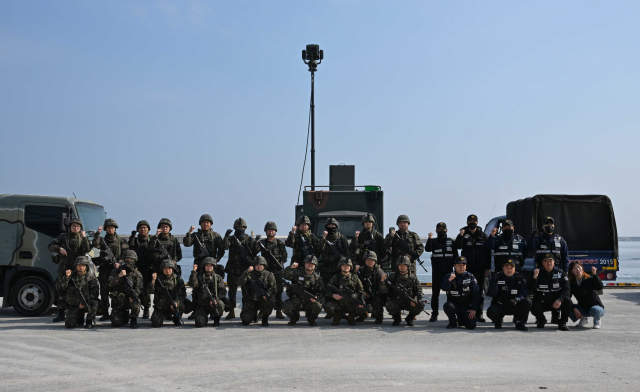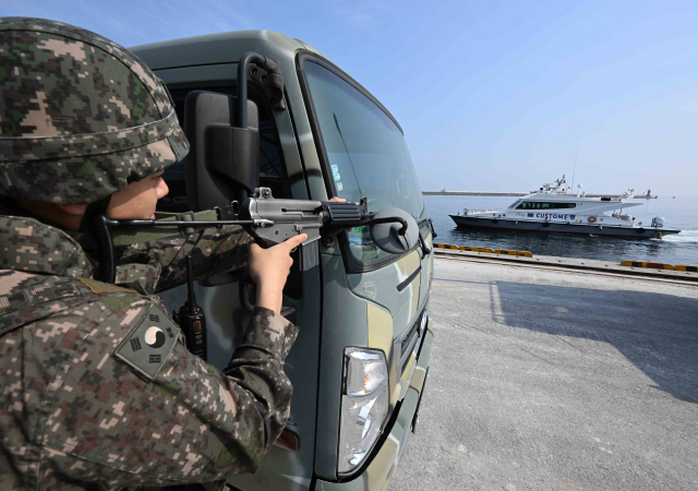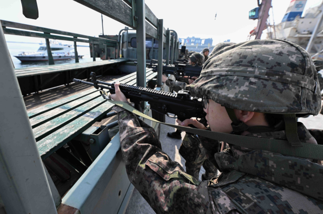 11일 동해항에서 1함대 주관으로 실시된 '동해항 통합 항만방호훈련'에서 1함대 기지방호전대 및 육군 23경비여단 소속 장병들이 동해항을 침투한 가상의 적선(동해세관 세관정이 모사)을 향해 총을 겨누고 있다.해군 1함대사령부(이하 1함대)는 11일 동해항과 동해상에서 ‘2026 자유의 방패(FS·Freedom Shield)’ 연습의 일환으로 통합 항만방호훈련을 실시했다.