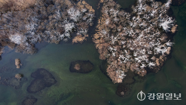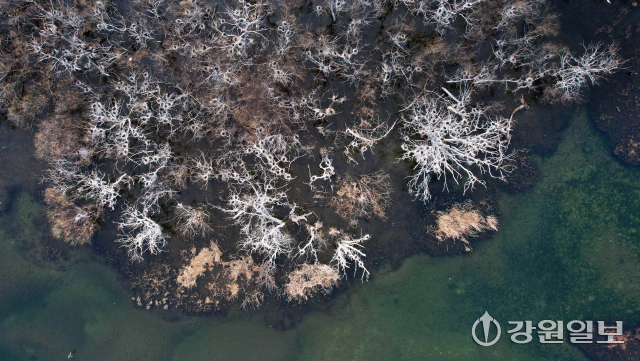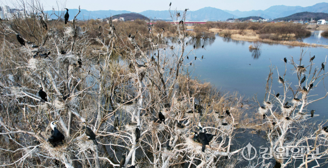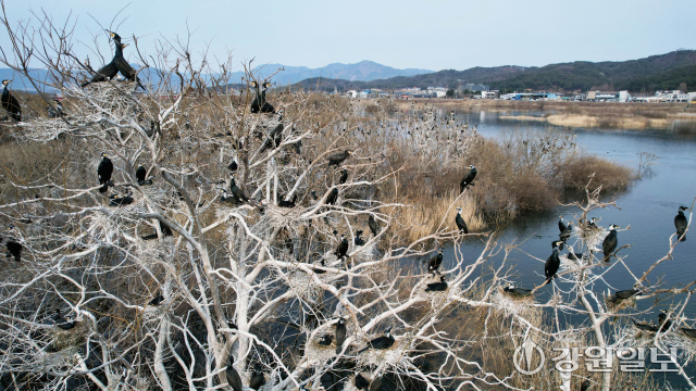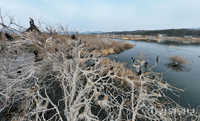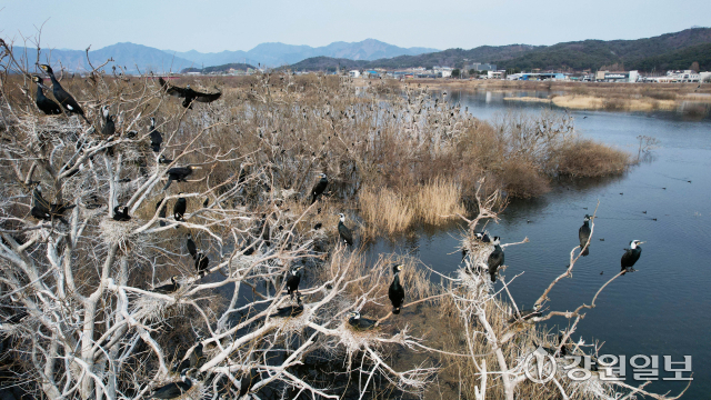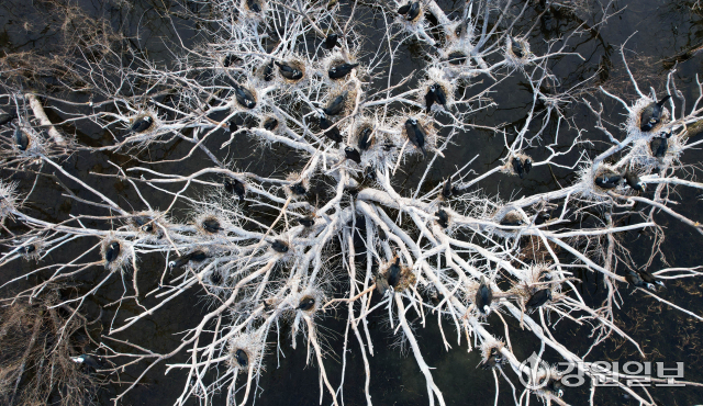봄철 도내 하천 등을 중심으로 번식을 시작한 민물가마우지의 개체수가 급격히 증가하고 있어 생태계 교란이 우려되고 있다. 11일 민물가마우지가 해마다 둥지를 틀고 있는 춘천시 소양강 왕버들 군락이 새들의 배설물로 인한 백화현상으로 하얗게 말라죽어 있다. 박승선기자