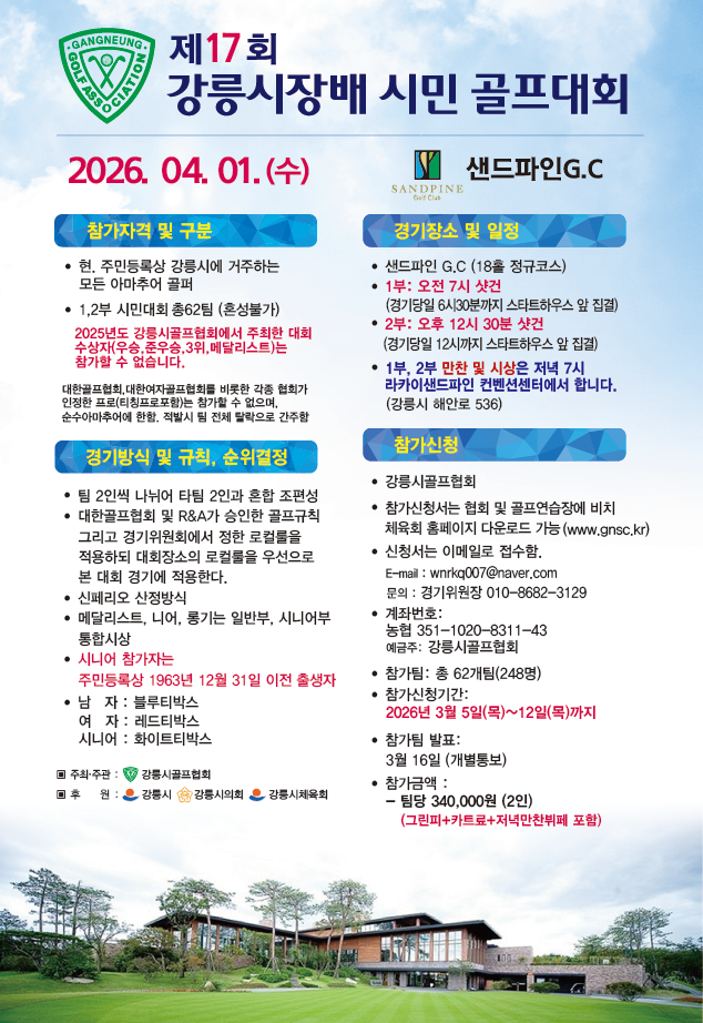 【강릉】‘제17회 강릉시장배 시민 골프대회’가 다음달 1일 샌드파인 G.C에서 열린다.