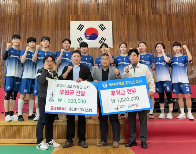 (주)새로이시스템(대표:임영석)과 (주)디자인얼(대표:박지민)은 12일 강원특별자치도체육회 세팍타크로팀이 훈련하고 있는 춘천도시공사 체육관을 방문, 이들에게 각각 후원금 100만원을 전달했다.