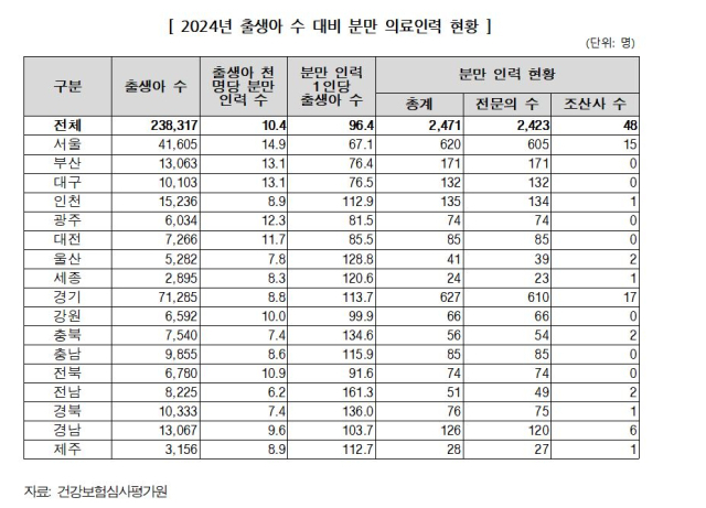 대도시 지역은 출생아 대비 분만 인력 비율이 높은 반면 지방 중소도시는 의료진 1명이 담당해야 하는 분만 부담이 상대적으로 큰 상황이다.