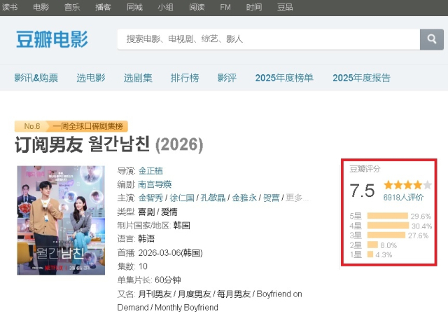 월간남친은 지난 6일 공개 이후 3일 만에 '글로벌 주간 톱10 비영어 TV쇼 부문' 4위에 올랐다.