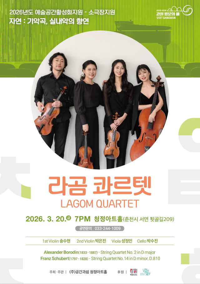 이번 무대에서 라곰 콰르텟은 ‘보로딘 현악4중주 제2번’의 서정적인 선율을 전한다. 이어 ‘슈베르트 현악4중주 제14번’을 연주하며 깊은 감성과 섬세한 앙상블을 선사한다. 이번 공연을 기획한 청정아트홀은 강원문화재단 예술공간활성화 지원을 통해 올 한 해 독주곡, 성악곡, 실내악과 문학 프로그램 등 다채로운 문화의 장을 연다. 첫 무대인 라곰 콰르텟의 공연을 시작으로 실내악의 향연이 이어질 예정이다.