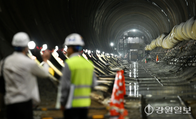 강원특별자치도가 최근 춘천~속초 동서고속철도 8개 공구 전 구간에 대한 현장점검을 벌인 결과 7공구(인제 북면 용대리~고성 토성면) 산악터널 구간 공정율이 34%를 돌파했다. 춘천 의암호 수중으로 하저(河底)터널을 연결하는 1공구(춘천시 근화동~신북읍)도 공정이 25%를 넘어섰다.