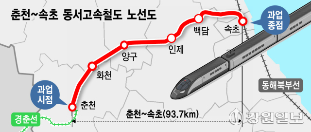 춘천~속초 동서고속철도는 전체 93.7㎞ 구간으로 기존 경춘선과 연결된다. 춘천, 화천, 양구, 인제, 백담, 속초역을 지나며 KTX-이음 열차가 도입될 예정이다.