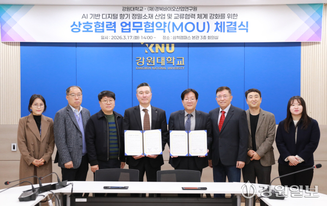 강원대와 경북바이오산업연구원은 지난 17일 강원대 삼척캠퍼스에서 ‘AI 기반 디지털 향기 정밀소재 산업 육성 및 교류협력 강화를 위한 업무협약(MOU)’을 체결했다.