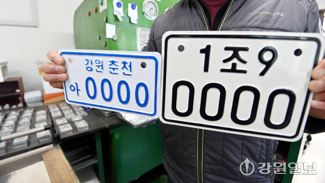 19일 춘천자동차등록번호판발급대행소에서 직원이 새로 도입되는 이륜차 전국 번호판을 보여주고 있다. 20일 이후 사용신고 하는 이륜차는 지역 표기가 없고 크기도 커져 시인성이 개선된 전국 번호판을 부착하게 된다. 임도혁기자