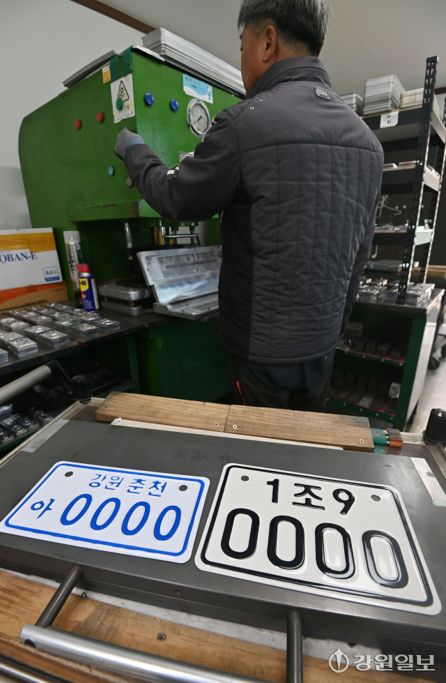 19일 춘천자동차등록번호판발급대행소에서 직원이 새로 도입되는 이륜차 전국 번호판 샘플을 제작하고 있다. 20일 이후 사용신고를 하는 이륜차는 지역 표기가 없고 크기도 커진 전국 번호판을 부착하게 된다. 임도혁기자