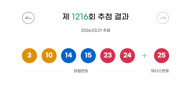22일 동행복권에 따르면 제1216회 로또복권 추첨에서 ‘3, 10, 14, 15, 23, 24’ 중 당첨번호 5개와 보너스번호 ‘25’ 맞힌 2등은 원주시 태장동, 원주시 흥양리, 홍천읍 진리 등 강원도내 3명 포함 전국에서 87명이 나왔다. 이들은 당첨금으로 각 5,762만원씩 받는다.