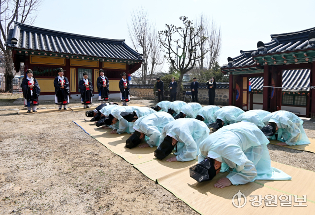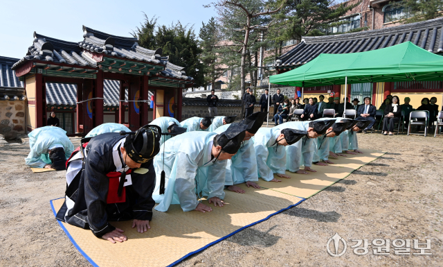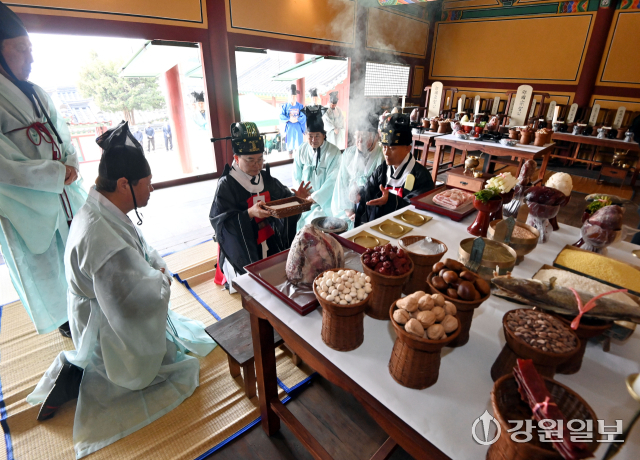 24일 춘천향교에서 열린 춘기석전대제에서 육동한 시장이 초헌관을 맡아 제례를 봉행하고 있다 임도혁기자