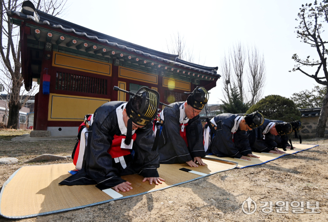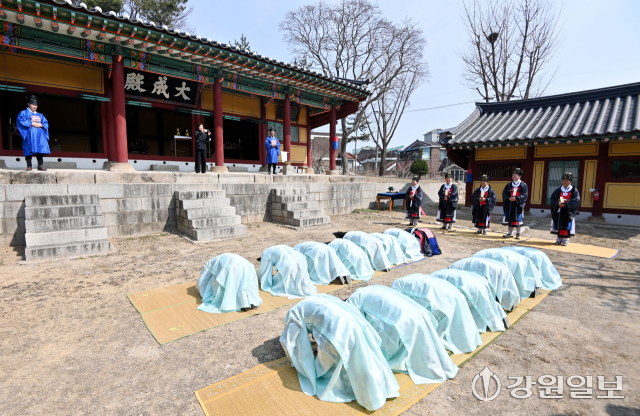 24일 춘천향교에서 열린 춘기석전대제에서 육동한 시장이 초헌관을 맡아 제례를 봉행하고 있다. 임도혁기자