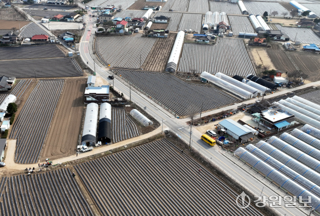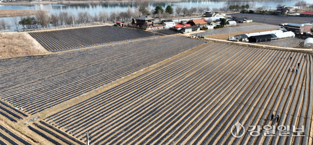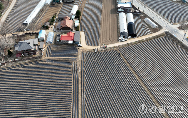 중동정세로 인한 나프타 수급 불안정으로 비닐하우스와 밭농사에 쓰이는 멀칭 비닐 가격마저 올라 농번기를 맞은 농민들의 어려움이 커지고 있다. 26일 감자파종이 시작된 춘천시 서면 감자밭에 검은색 비닐로 이랑을 덮는 멀칭 작업이 이뤄져 있다.