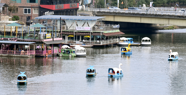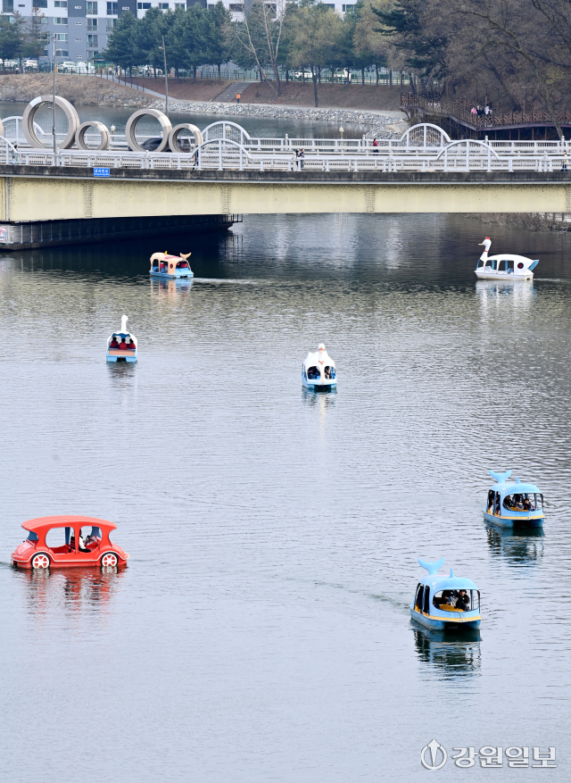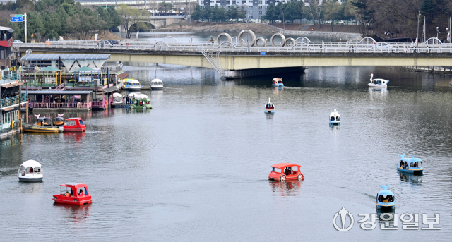 완연한 봄날씨를 보인 29일 춘천 공지천 유원지를 찾은 시민들이 오리배를 타며 봄기운을 만끽하고 있다.