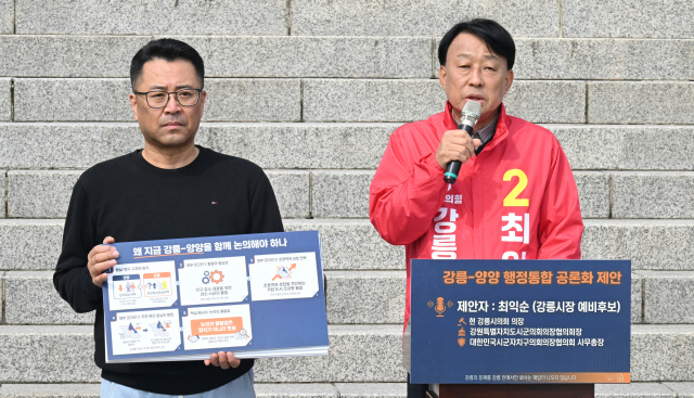 최 의장은 1일 강릉시청 앞에서 기자회견을 열고 “강릉과 양양 모두 인구감소와 지역 활력 저하라는 공통의 위기 앞에 서 있다”며 “통합을 더 이상 미룰 수 없는 지역의 과제로 보고 공식적인 공론화를 제안한다”고 말했다.