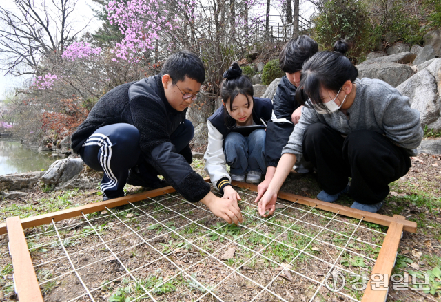 1일 강원대 춘천캠퍼스 연적지 일대에서 과학교육학부 생물교육전공 학생들이 일정 구역을 설정해 식물의 종류와 분포를 조사하는 '방형구법'을 활용해 봄철 식물 조사를 하고 있다. 학생들이 표시한 작은 네모 구역 안에는 다양한 봄 식물들이 싹을 틔우며 자라고 있다. 이날 조사에서는 냉이와 망초 등이 관찰돼 학생들이 식물의 분포와 생장 상태를 기록했다.