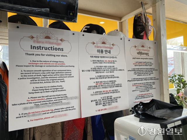 ◇고성 토성면 경동대 인근 한 무인점포의 안내 문구가 한국어와 영어, 힌디어 등으로 표기돼 있다.