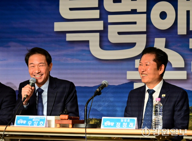 ■정부·여당 전폭 지원 VS 지난 4년의 성과=양측의 성과쟁탈전은 더욱 과열될 전망이다. 이미 지난달 31일 강원특별법 3차 개정 국회 통과 당시 여야 모두 자신들의 성과로 홍보했다. 발의가 임박한 4차 개정 역시 당초 갈등을 낳을 것이라는 예상과 달리 여야가 공동대표 발의할 전망이다. 지역 현안을 외면한다는 프레임을 차단하고 선거 전 급물살을 탈 경우 성과를 내세울 수도 있기 때문이다. 또 김진태 지사가 최근 포천~철원고속도로와 속초~고성 고속도로의 예타 통과 필요성을 강조하자 정청래 민주당 대표가 철원을 방문해 포천~철원고속도로는 물론 중앙고속도로 연장까지 약속하는 등 표심을 자극하기 좋은 SOC분야의 성과 경쟁도 이어질 전망이다.