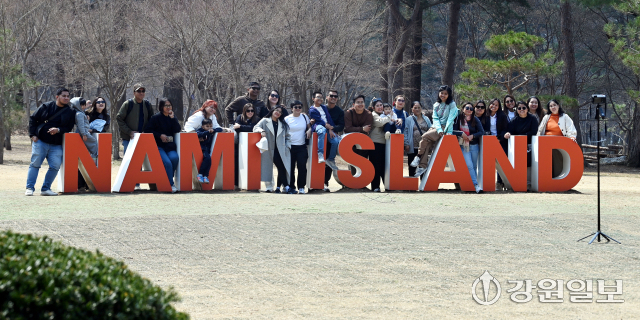 포근한 봄날씨를 보인 2일 춘천 남이섬을 방문한 외국인 관광객들이 단체사진을 촬영하고 있다. 임도혁기자