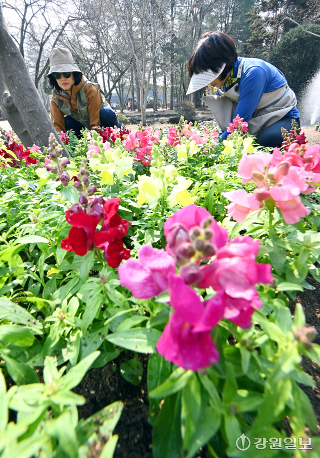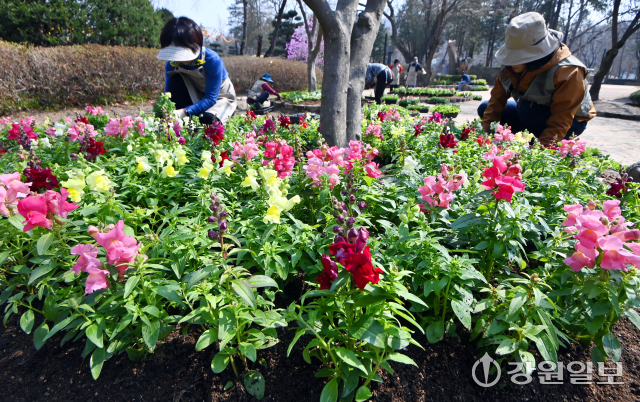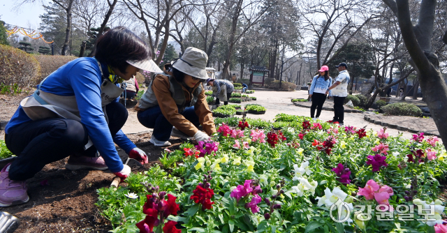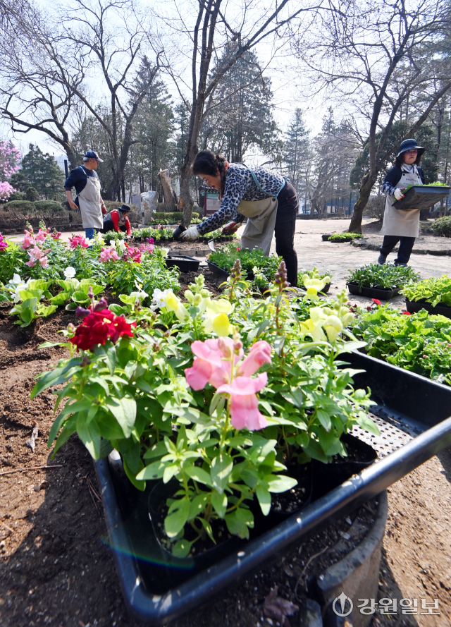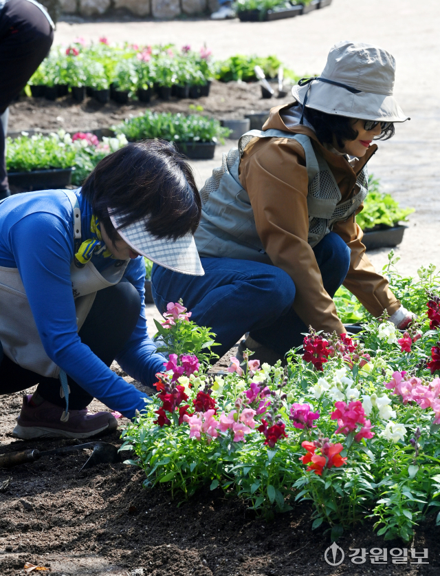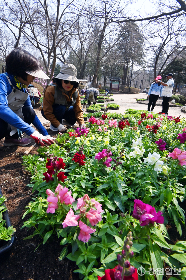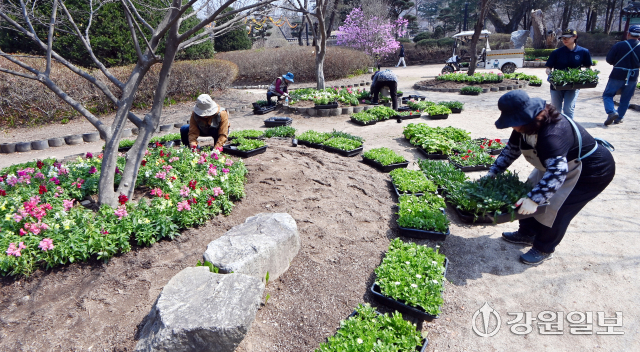 완연한 봄날씨를 보인 2일 춘천 남이섬 봄내플라워가든에서 시민정원사들이 봄꽃을 심는 자원봉사활동을 하고 있다. 임도혁기자