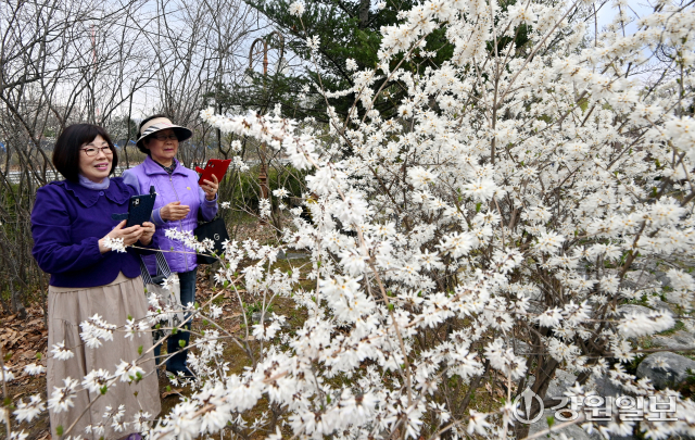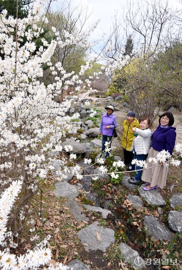 1일 춘천시 사농동 도립화목원에서 시민들이 활짝 핀 미선나무 꽃을 바라보며 봄기운을 만끽하고 있다.
