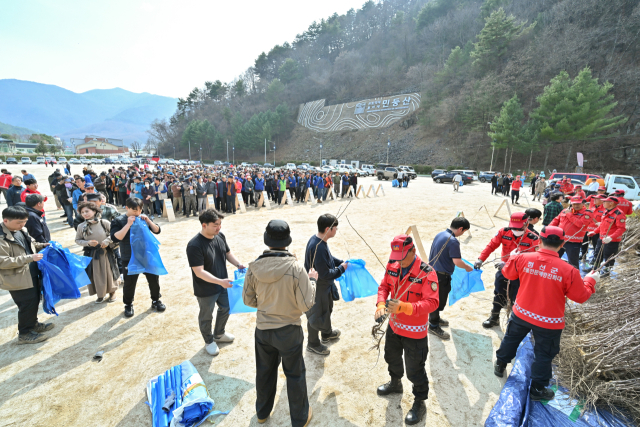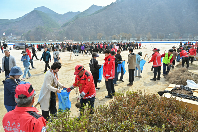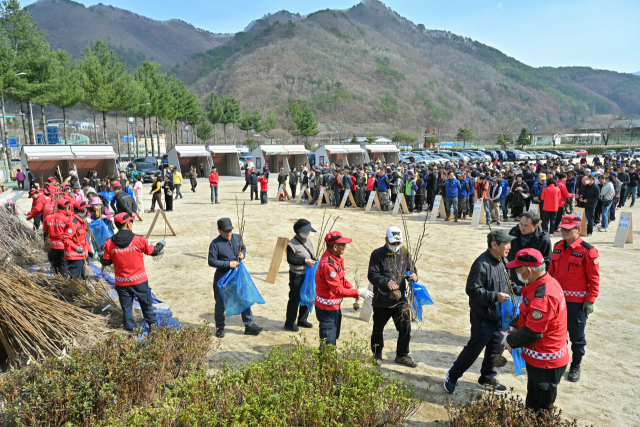 이날 정선군은 매실·돌배·체리나무를 각각 1,300그루씩, 대추 1,230그루를 나눠줬고, 정선국유림관리소는 산철쭉 500그루와 산벚나무 500그루 등 1,000그루를, 정선군산림조합은 산철쭉 2,000그루를 선착순 배부하며 6종 8,100그루를 주민들에게 모두 나눠줬다.