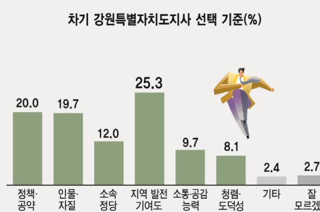 강원도민들은 차기 도지사 후보들의 '지역 발전 기여도'와 '정책·공약'을 최종 선택의 기준점으로 두고 있는 것으로 나타났다.