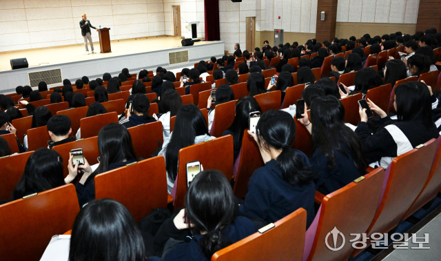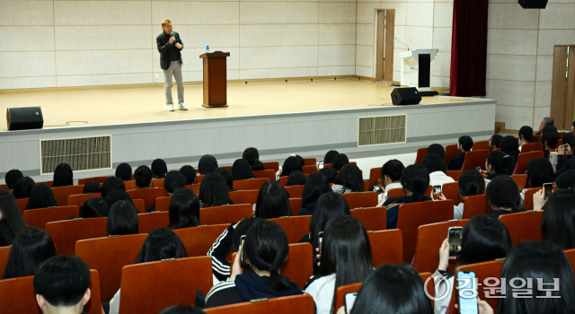 김병지 강원FC 대표이사가 6일 춘천여고에 방문해 진로탐색 특강을 하고 있다. 이날 김 대표는 춘여고 농구부와 펜싱부 학생 육성 지원을 위한 학교발전기금 1,000만원을 기탁했다.
