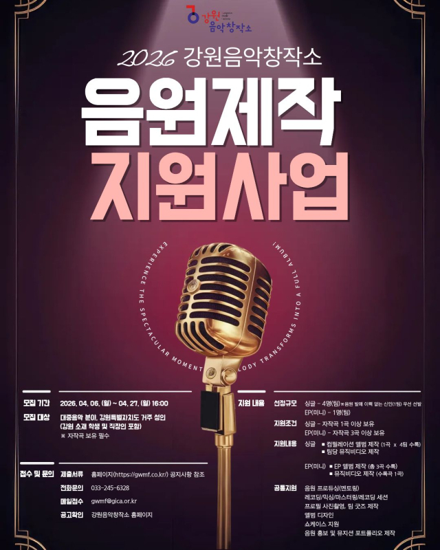 강원음악창작소가 오는 27일까지 ‘2026년 음원제작 지원사업’ 참여 음악가를 모집한다.