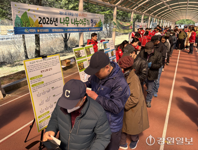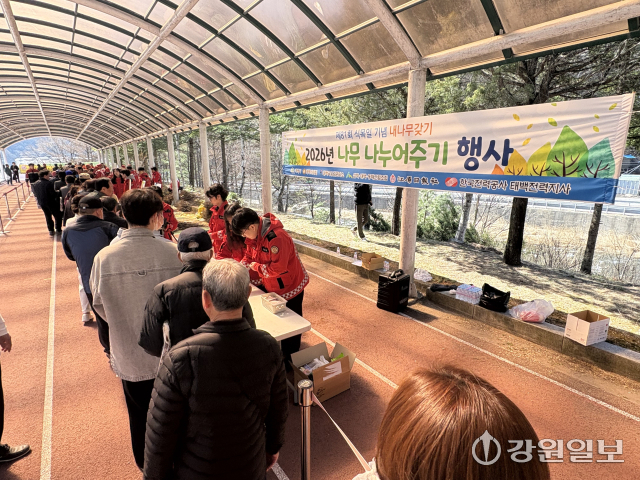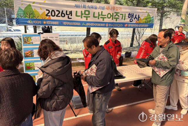 태백 식목일 나무 나누어주기 성황… 시민들 ‘내 나무’ 받아가◇태백 제81회 식목일 기념 2026년 나무 나누어주기 행사가 8일 태백종합경기장에서 성황리에 열렸다. 이번 행사는 태백시, 강원일보, 태백시의회, 태백국유림관리소, 삼척·태백·동해산림조합, 한국전력공사 태백지사·태백전력지사가 함께 마련했다.◇태백 제81회 식목일 기념 2026년 나무 나누어주기 행사가 8일 태백종합경기장에서 성황리에 열렸다. 이번 행사는 태백시, 강원일보, 태백시의회, 태백국유림관리소, 삼척·태백·동해산림조합, 한국전력공사 태백지사·태백전력지사가 함께 마련했다.◇태백 제81회 식목일 기념 2026년 나무 나누어주기 행사가 8일 태백종합경기장에서 성황리에 열렸다. 이번 행사는 태백시, 강원일보, 태백시의회, 태백국유림관리소, 삼척·태백·동해산림조합, 한국전력공사 태백지사·태백전력지사가 함께 마련했다.◇태백 제81회 식목일 기념 2026년 나무 나누어주기 행사가 8일 태백종합경기장에서 성황리에 열렸다. 이번 행사는 태백시, 강원일보, 태백시의회, 태백국유림관리소, 삼척·태백·동해산림조합, 한국전력공사 태백지사·태백전력지사가 함께 마련했다.