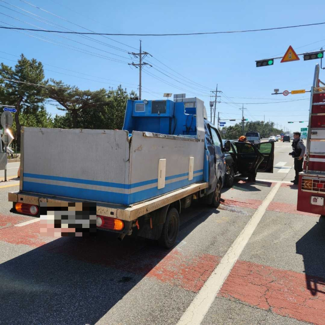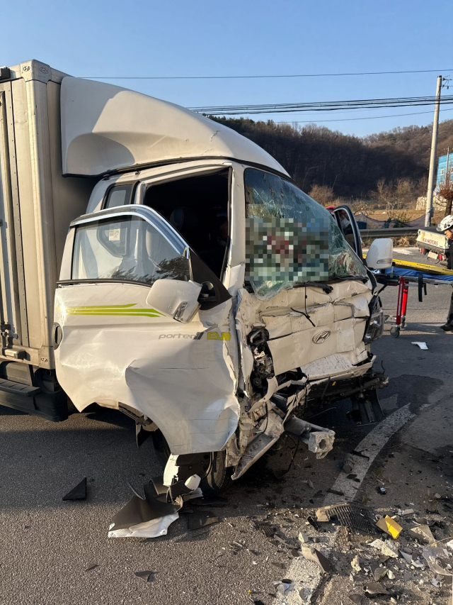 ◇8일 오전 10시57분께 양양군 현남면 원포사거리 인근에서 포터 트럭과 그랜저 승용차가 부딪쳤다. 사진=강원특별자치도소방본부 제공