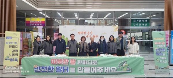 참가자들은 시청을 방문한 시민들에게 홍보물과 기념품을 배부하며 상호 존중 문화 조성 및 근로자 권익 보호를 위한 메시지를 전했다. 특히 ‘따뜻한 말 한마디로 안전한 일터를 만들어 주세요’라는 슬로건을 통해 시민들의 자발적인 공감과 참여를 유도했다.