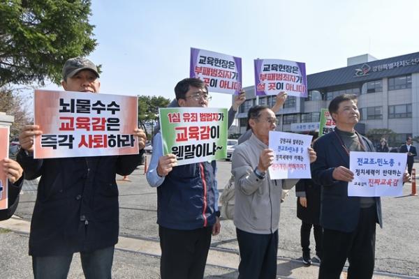 내란청산·사회대개혁 강원비상행동을 포함한 38개 시민사회단체, 강원학부모연합과 참교육을위한전국학부모회 강원지부, 평등교육실현을위한강원학부모회 등은 이날 선거관리위원회 정문에서 피켓 시위를 벌였다. 이들은 ‘뇌물수수 교육감은 즉각 사퇴하라’ ‘1심 유죄 범법자가 교육감이 웬 말이냐’ ‘교육현장은 부패범죄자가 설 곳이 아니다’ 등의 문구가 적힌 피켓을 들고 신 교육감의 재선 도전을 비판했다.