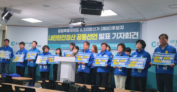 강원촛불행동은 15일 오전 11시 춘천시청 8층 브리핑룸에서 기자회견을 열고 ‘6.3 지방선거(예비) 후보자 내란 완전 청산 공동선언’을 발표했다.