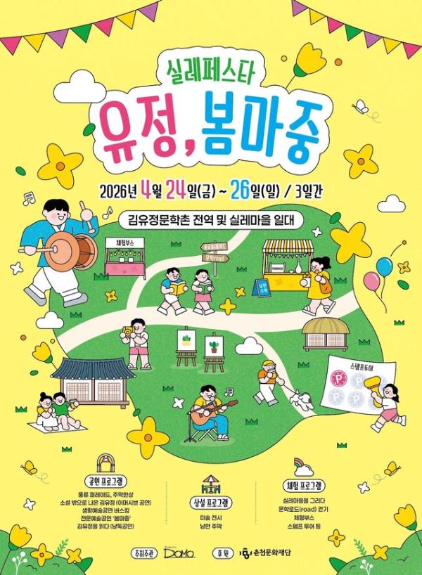 김유정의 해학과 서정이 실레마을서 되살아 난다. (사)문화프로덕션도모는 오는 24일부터 26일까지 김유정 문학촌을 비롯한 실레마을 일대에서 ‘실레페스타 유정, 봄마중 축제’를 개최한다. 공연·체험·전시 프로그램으로 구성된 축제는 예술과 공간, 공간과 사람을 연결하는 장으로 거듭난다.