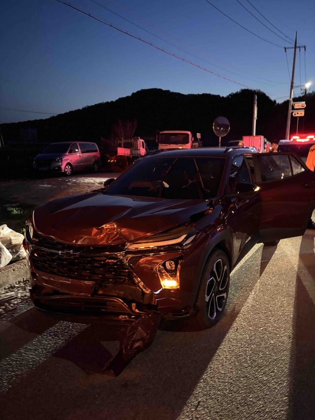 지난 19일 오후 7시27분께 원주시 지정면 광터교사거리 인근에서 트랙스 승용차와 BMW 차량이 부딪쳤다.