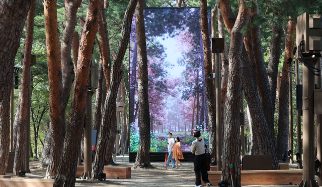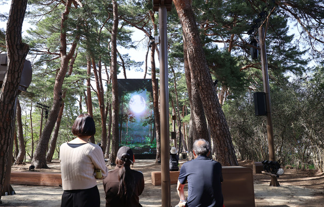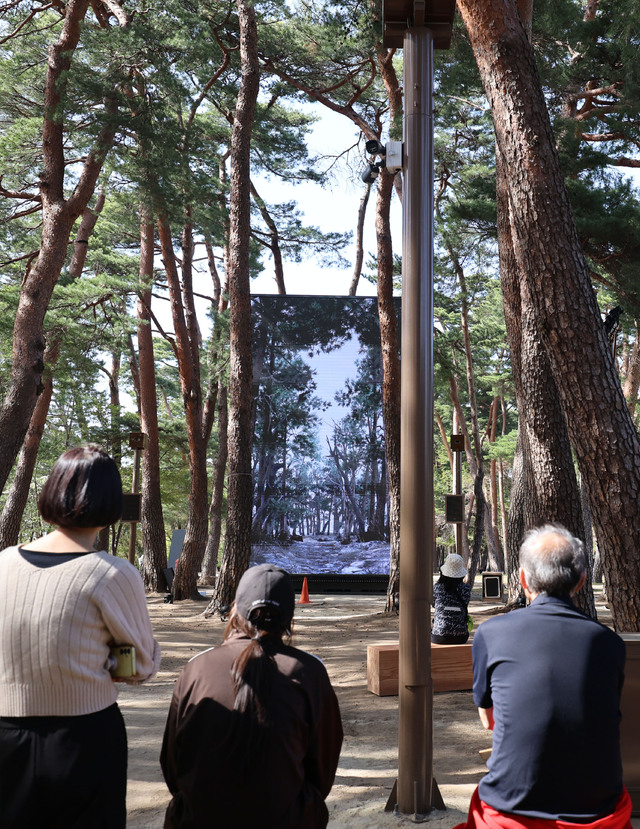 20일 강릉시 초당동 허균난설헌기념공원 내 소나무 숲에서 시민들이 대형 화면으로 시험 가동 중인 실감형 미디어아트를 보고 있다. 강릉시가 경포 환상의 호수 실감 콘텐츠 구축 사업의 하나로 추진하는 이 사업은 5월부터 본격 운영될 예정이다. 권태명 기자 kwon@kwnews.co.kr