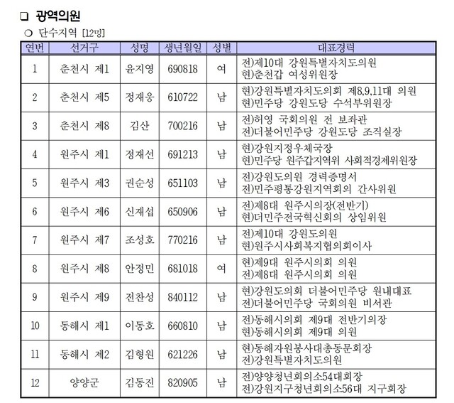 이에 따라 광역의원 춘천 1선거구 윤지영, 5선거구 정재웅 후보가, 새롭게 신설된 8선거구에는 김산 후보가 단수 공천을 받았다. 춘천 2선거구는 이교선·이혜영 △춘천3 김양욱·원태경 △춘천4 이승진·황관중 후보가 경선을 치른다.