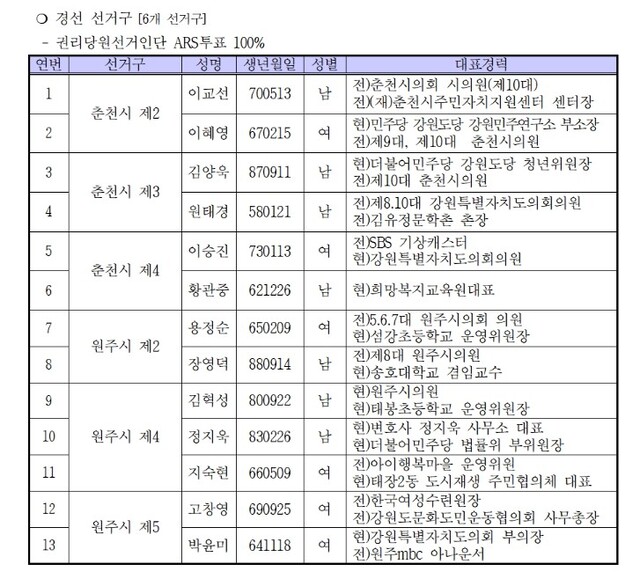 이와 함께 22~23일 춘천 강릉 동해 태백 삼척 속초 정선 고성 홍천 평창 화천 양구 기초 비례대표 후보자 선출을 위한 경선을 실시, 24일 발표할 예정이다.