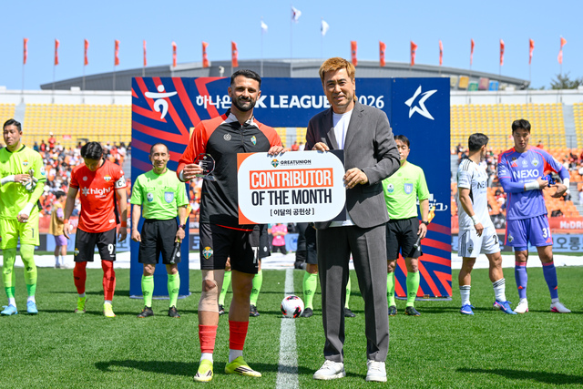 강원FC는 지난 18일 강릉하이원아레나에서 열린 하나은행 K리그1 2026 8라운드 전북현대와의 홈경기에서 시상식을 열고 선수단과 프런트 부문 수상자를 각각 발표했다. 2024년부터 이어진 이달의 공헌상은 구단 발전에 힘을 보탠 ‘언성 히어로’를 선수단과 프런트에서 1명씩 뽑아 시상하는 제도다.