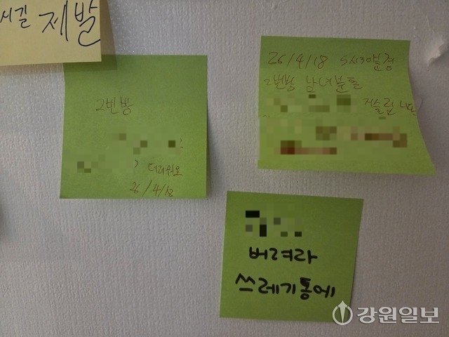 실제 업소 로비 벽면에 붙은 이용자들의 건의문에는 “사적인 행위로 인한 소음이 불편하다”, “피임도구는 쓰레기통에 버려달라”는 문구로 가득차 이 공간이 어떻게 이용되고 있는지 적나라하게 보여줬다.