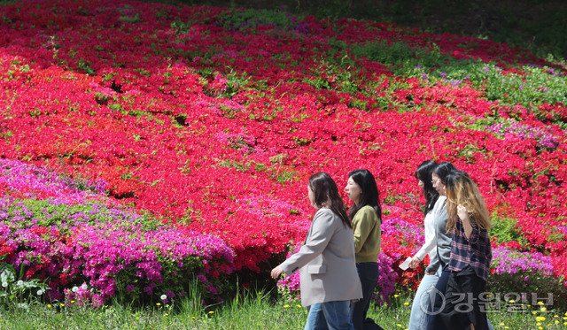 화창한 날씨를 보인 23일 강원대 강릉캠퍼스에서 학생들이 만개한 영산홍 길을 따라 강의실로 향하고 있다. 강릉=권태명기자화창한 날씨를 보인 23일 강원대 강릉캠퍼스에서 학생들이 만개한 영산홍 길을 따라 강의실로 향하고 있다. 강릉=권태명기자화창한 날씨를 보인 23일 강원대 강릉캠퍼스에서 학생들이 만개한 영산홍 길을 따라 강의실로 향하고 있다. 강릉=권태명기자