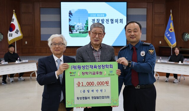 ◇횡성경찰서(서장:장은석)와 경찰발전협의회(회장:최재영)는 23일 경찰서 대회의실에서 2026년 경찰발전협의회 정기회의를 갖고 횡성인재육성장학회 장학금 100만원을 전달했다.